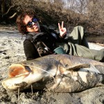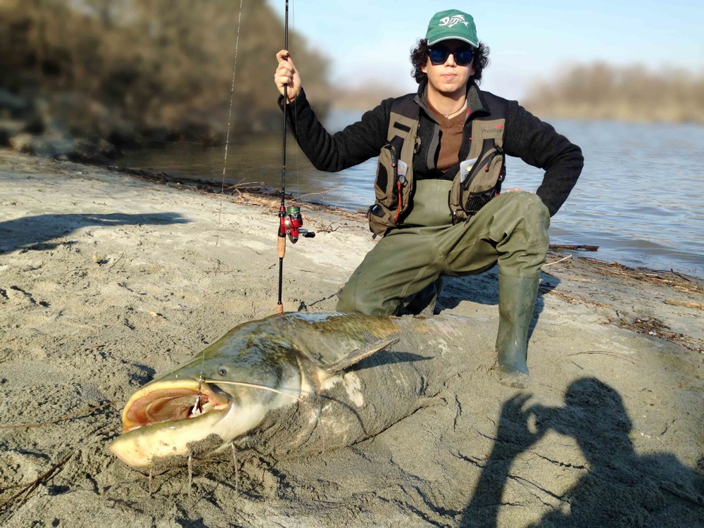 Ondulante in bocca a un siluro da 190 cmLa tenacia è premiata dalla fortuna, dopo una decina di minuti mi sembra che il pesce sia stanco. Le ripartenze sono più rare, e gli ancoraggi al fondo più frequenti. Jacopo è sempre lì a spronarmi dandomi consigli su come gestirlo. Sembra quasi fatta ma niente. Riparte. La sensazione è un misto di adrenalina, sconforto, eccitazione e paura di perdere il gigante acquatico. Continuo a forzare con la consapevolezza che lo perderò. Dopo alcuni minuti e incoraggiamenti di Jacopo lo vedo. E a 6/7 metri da noi e vediamo un pezzo di coda a galla, è davvero enorme. Jacopo entra nel fiume ma non si capisce, nelle torbide acque, dove sia la testa. La vicinanza di Jacopo lo fa a dimenare ancora un po’. Recupero, alzo, forzo, la mia canna è piegata come l’asta di una saltatore alle olimpiadi. Non so come sia possibile ma eccolo: la testa immensa affiora, Jacopo, dopo il “tutoring” sulla frizione nel recupero, riesce adesso a mettergli le mani in bocca e a portare a termine l’operazione di “gloving” con assoluta maestria.