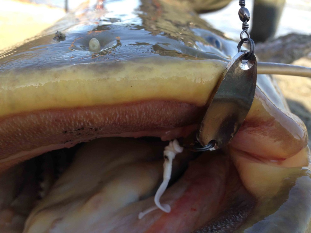 Una volta spiaggiato controllo l’esca in bocca, il cucchiaio è appuntato appena dietro la linea dei denti con un solo amo agganciato e, ovviamente, tutti gli ami dell’ancoretta sono leggermente aperti. Siamo basiti. Corro a cercare Pietro che mi racconta della breme che l’aveva fatto sperare in qualcos’altro e mentre ritorniamo Jacopo sta misurando il silurus glanis: 130, 140, 150, il metro è finito e manca un quarto di pesce. Completiamo le operazioni di misurazione: 190 cm pieni! Un piccolo gruppo di pescatori si è raccolto vicino a noi per vedere il pescione, spinner e passatisti, tutti meravigliati e testimoni dell’accaduto.