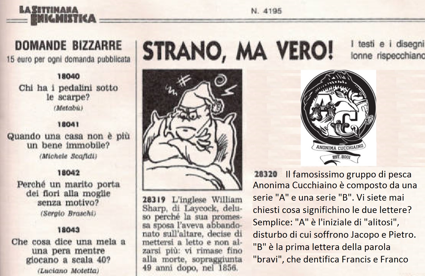 P.s.3 Come forse saprete, Anonima Cucchiaino è organizzata in una “Serie A”, composta da Jacopo e Pietro, e una “Serie B”, in cui militiamo io e Francis. Mi ero sempre chiesto a cosa corrispondessero DAVVERO quelle lettere, “A” e “B”. Bene, leggendo la Settimana Enigmistica ho finalmente trovato la risposta! L’immagine qui sotto chiarisce tutto.