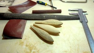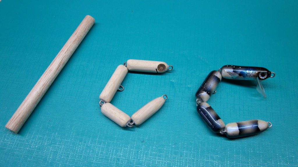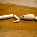 Innanzitutto parto dallo scopo di quell’artificiale, o per meglio dire dal pesce target al quale l’artificiale è destinato. Successivamente cerco di immaginare (e qui un minimo di esperienza mi ha aiutato molto) dove questo pesce possa trovarsi, quali territori di caccia e quali condizioni attivano l’istinto predatorio, quale dieta e in che periodo, insomma cerco di rendere tutto il più naturale possibile. Solo dopo inizio il lavoro vero e proprio. Per le anguillette parto da un tondino sul quale creo una fresatura per tutta la lunghezza, che servirà successivamente ad alloggiare l’armatura (che in tutte le esche che realizzo è passante). Fatto ciò, taglio il pezzo fresato in tanti pezzi quanti saranno quelli che costituiranno l’artificiale. Dopo aver inserito l’armatura all’interno della fresatura, piombo l’esca q.b., stucco, carteggio, passo il protettivo per il legno (turapori nitro o fondo poliuretanico bi componente) e alla fine il fondo bianco sul quale andrò a dipingere le livree.