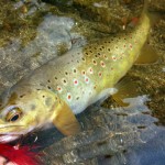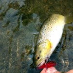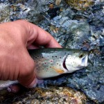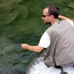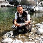 Intanto, mentre mi chiedo se saprò essere all’altezza del compito, Matte mi raggiunge, infiliamo i waders e via. Le primissime luci dell’alba illuminano il Sesia mentre il cielo è splendidamente coperto. La prima lama che aggrediamo non ci riserva grandi sorprese. Qualche troterella qui e là ma poi ho la fortuna di portare a riva una marmoratina che, anche se arriva a stento a 25 cm, ha una livrea così perfetta da sembrare dipinta e da sola vale la sveglia alle 3,30. La guardo un attimo in acqua, una veloce torsione dell’amo e schizza veloce sotto un sasso. Matteo si dedica a una bella pozza mentre io salgo per provare una correntina.