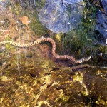 Biscia d'acqua che appostata in una pozza di giriniRipieghiamo sul più conosciuto Sermenza. L’acqua è cristallina, il vento sale e il sole splende. Le condizioni sono davvero pessime ma peschiamo e prendiamo alcune delle coloratissime fario di questo corso finché i morsi della fame ci suggeriscono di piazzare le gambe sotto il tavolo. Ci raggiungono il Savio e Francesco e, come spesso accade, la conversazione rimane piacevolmente incollata ad argomenti di interesse alieutico.