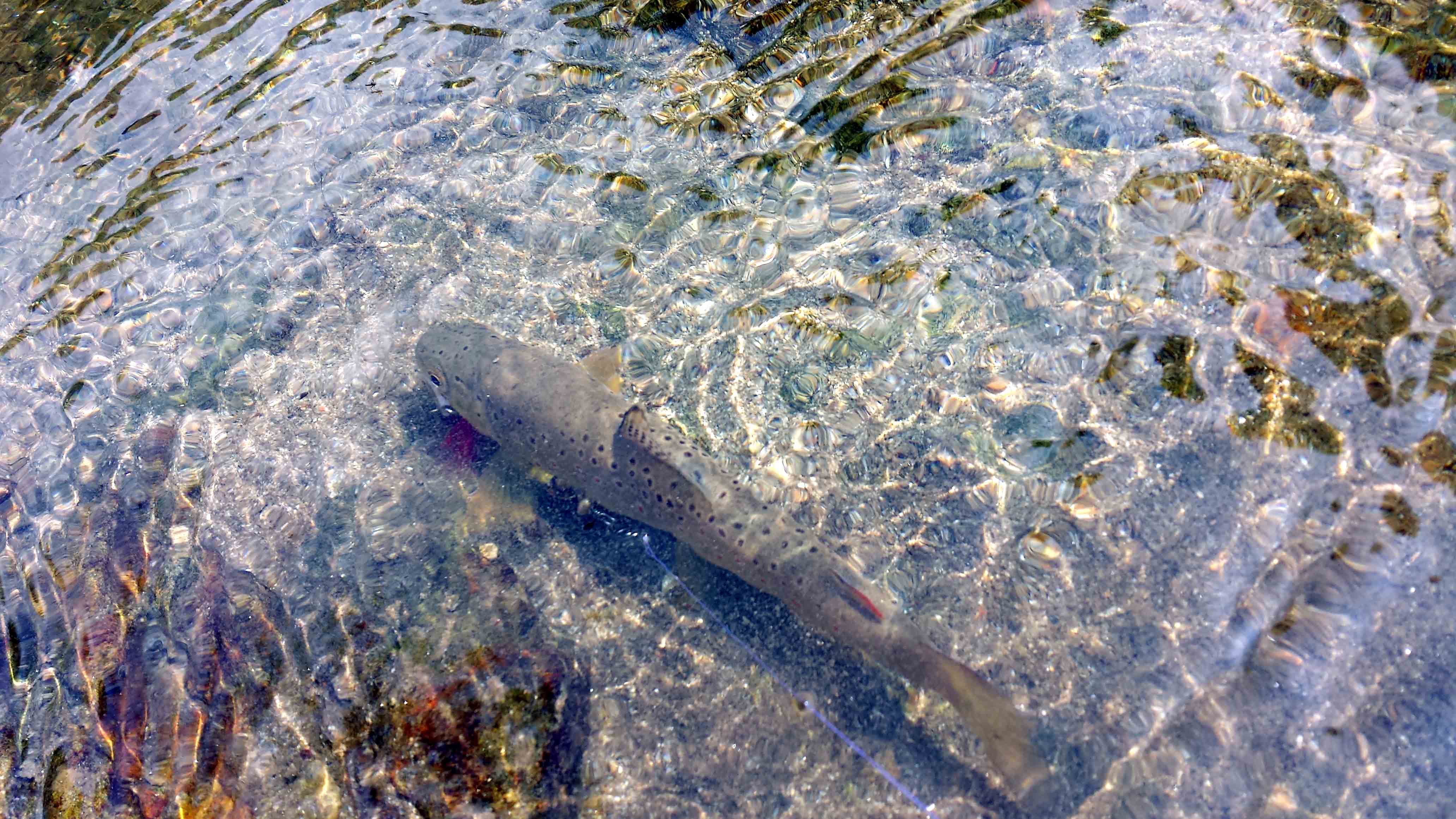 Intanto, mentre mi chiedo se saprò essere all’altezza del compito, Matte mi raggiunge, infiliamo i waders e via. Le primissime luci dell’alba illuminano il Sesia mentre il cielo è splendidamente coperto. La prima lama che aggrediamo non ci riserva grandi sorprese. Qualche troterella qui e là ma poi ho la fortuna di portare a riva una marmoratina che, anche se arriva a stento a 25 cm, ha una livrea così perfetta da sembrare dipinta e da sola vale la sveglia alle 3,30. La guardo un attimo in acqua, una veloce torsione dell’amo e schizza veloce sotto un sasso. Matteo si dedica a una bella pozza mentre io salgo per provare una correntina.