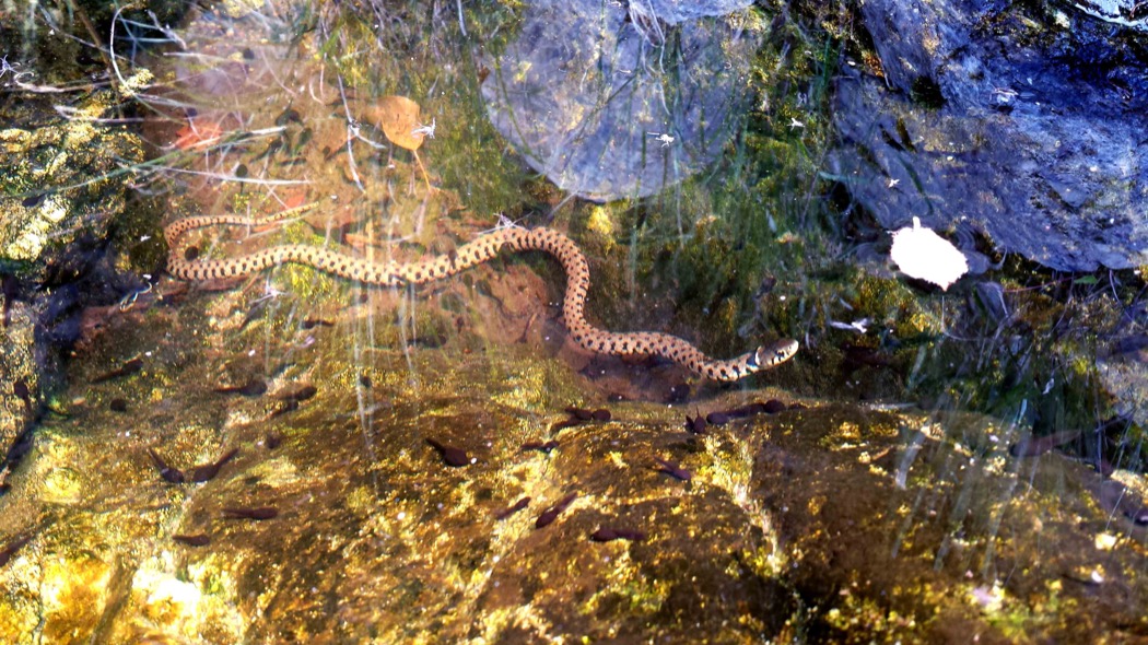 Biscia d'acqua che appostata in una pozza di giriniRipieghiamo sul più conosciuto Sermenza. L’acqua è cristallina, il vento sale e il sole splende. Le condizioni sono davvero pessime ma peschiamo e prendiamo alcune delle coloratissime fario di questo corso finché i morsi della fame ci suggeriscono di piazzare le gambe sotto il tavolo. Ci raggiungono il Savio e Francesco e, come spesso accade, la conversazione rimane piacevolmente incollata ad argomenti di interesse alieutico.