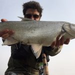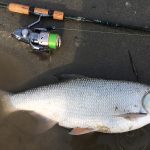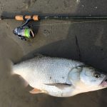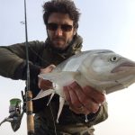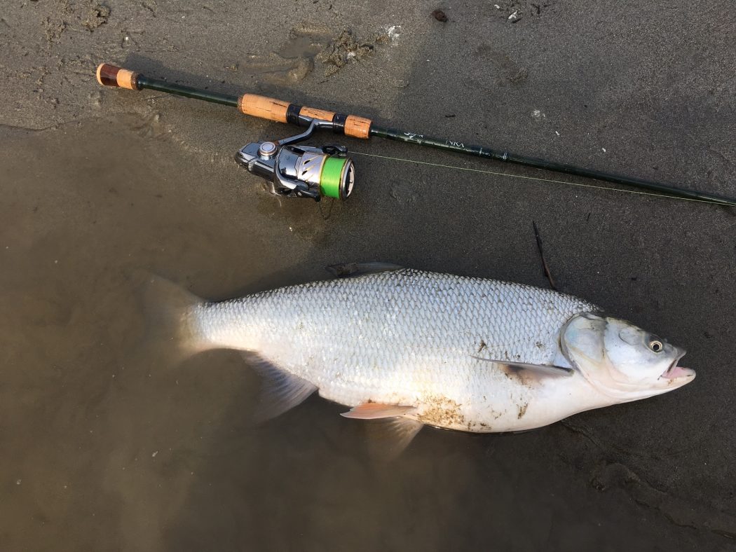 Ed eccola: una tuonata mi piega la canna, la lotta è entusiasmante e dubito perfino si tratti di un aspio, che solitamente si stanca in fretta, invece un bel padellone d’argento arriva a guadino. E’ lungo, passa i settanta centimetri, uno dei più grossi di quest’anno per me. Vorrei farmi una foto ma sono a parecchi metri dalla spiaggia, con l’acqua alla vita. Lo libero senza foto, peccato per il report. Sono già molto felice. Insisto un po’ ma nulla. Scendo a valle qualche decina di metri, comincio a sentire fame e freddo ai piedi, è l’una circa, l’azione di pesca è sempre la stessa, il trecciato nuovo, il Kairiki 0.15 fila via che è un piacere, una grande novità, lancio lunghissimo e affondo in fretta, soprattutto adesso che ho armato la mia esca preferita di sempre: un ondulante “ardito” argento.