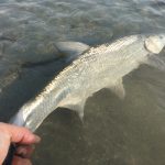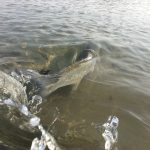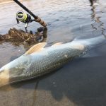 Altra botta in canna, altro pesce che tira con decisione e caparbietà, oggi gli aspi sono davvero in forma! La combo “rolex”, ovvero la canna fedele GLoomis NRX 822 6’6″ con stella 4000, si comporta proprio come un orologio svizzero e in poco tempo lo avvicino e vedo che è un pesce davvero spesso e massiccio, una femmina grossa e grassa e probabilmente carica di uova. Questa volta sono più vicino alla riva sabbiosa, la accosto e mi concedo un paio di foto prima del rilascio.