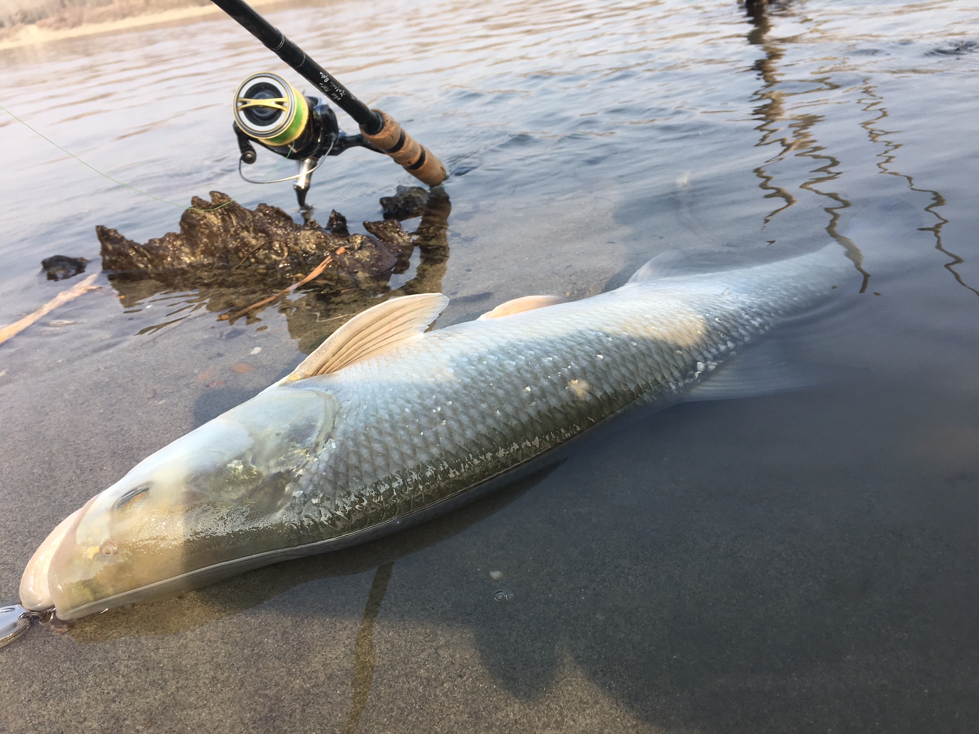 Ed eccola: una tuonata mi piega la canna, la lotta è entusiasmante e dubito perfino si tratti di un aspio, che solitamente si stanca in fretta, invece un bel padellone d’argento arriva a guadino. E’ lungo, passa i settanta centimetri, uno dei più grossi di quest’anno per me. Vorrei farmi una foto ma sono a parecchi metri dalla spiaggia, con l’acqua alla vita. Lo libero senza foto, peccato per il report. Sono già molto felice. Insisto un po’ ma nulla. Scendo a valle qualche decina di metri, comincio a sentire fame e freddo ai piedi, è l’una circa, l’azione di pesca è sempre la stessa, il trecciato nuovo, il Kairiki 0.15 fila via che è un piacere, una grande novità, lancio lunghissimo e affondo in fretta, soprattutto adesso che ho armato la mia esca preferita di sempre: un ondulante “ardito” argento.
